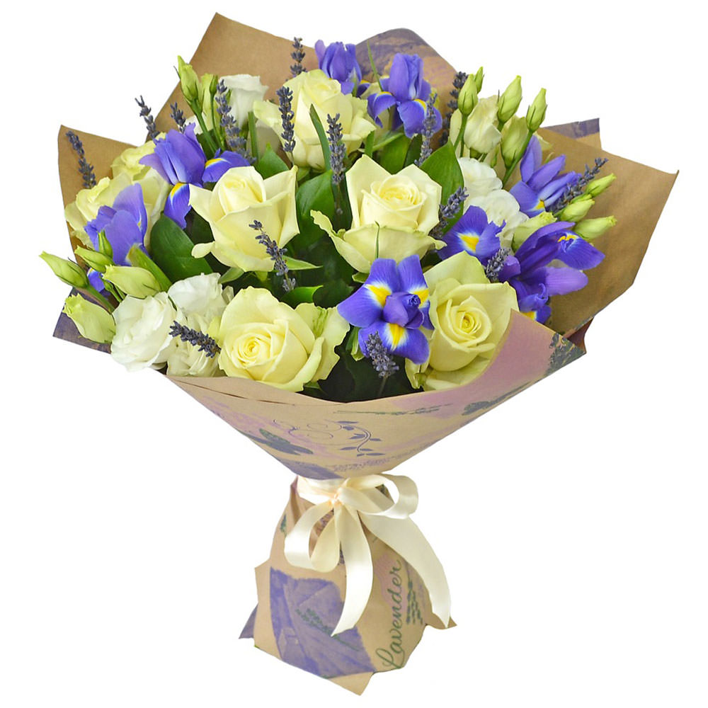 Роза одноголовая белая, ирис, эустома белая, вереск. Упаковка (лента, пленка, крафт, сетка, пленка матовая)